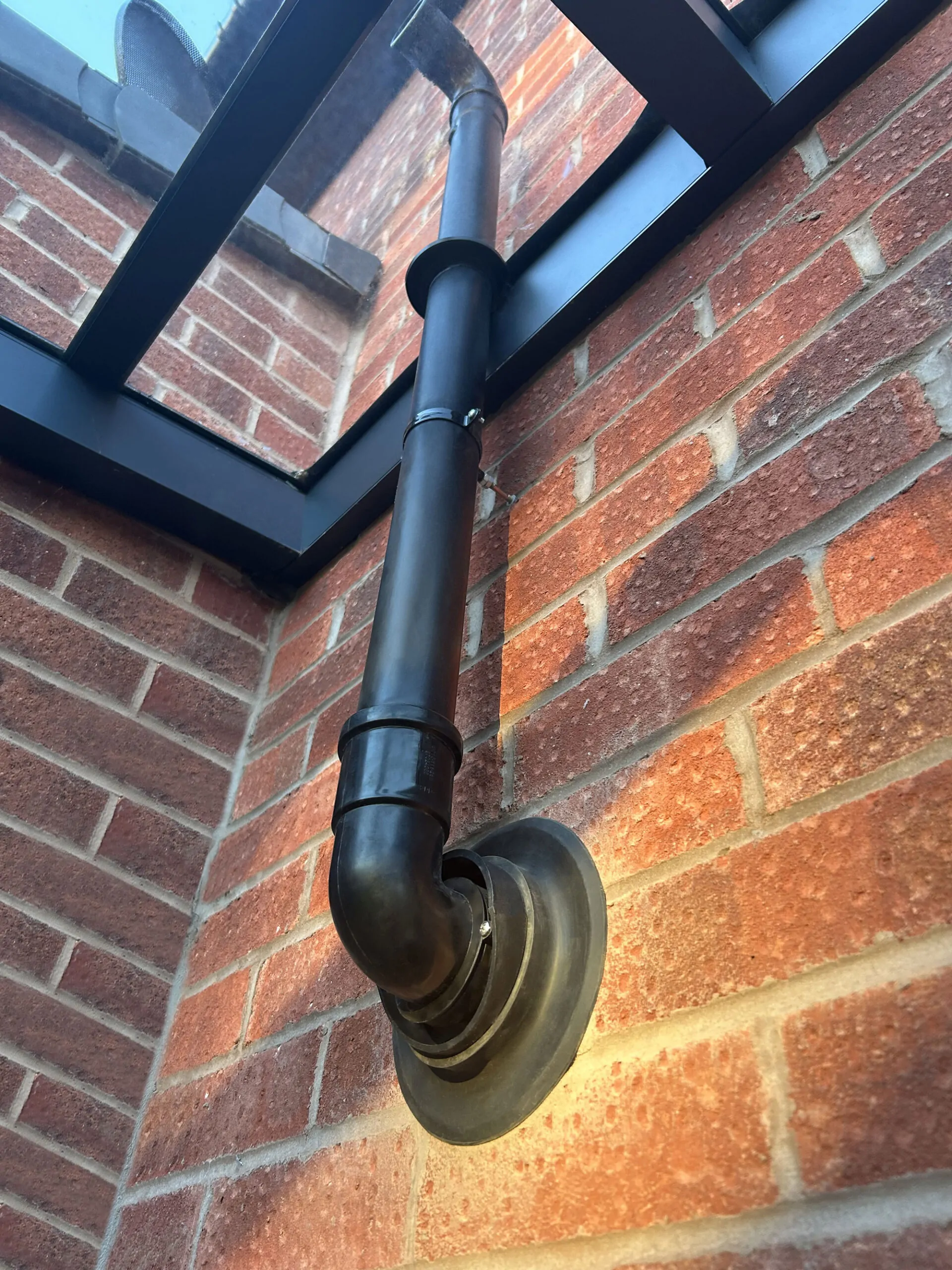 We use a silicone seal at the top and bottom of the cut, sealing it around the flue, or the soil pipe. Smaller flues, such as those used in boiler extension kits, can also have a pipe collar added to further minimise potential water ingress.