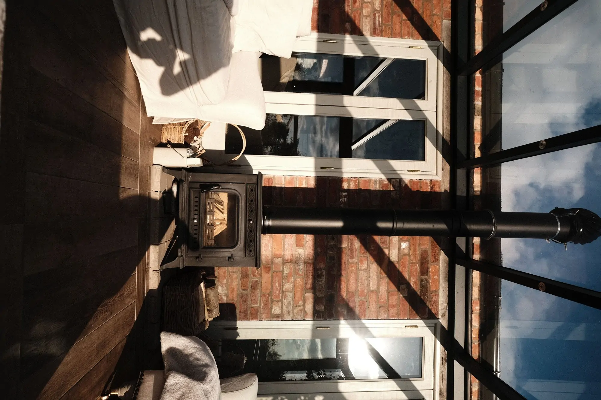 With wood-burning fires, acrylic glass and a glazing split can be used to incorporate the flue into the veranda roof system. Unlike the boiler flue extension which will always be close to the wall, customers can choose where to position their wood-burning fire, as long as it does not obstruct one the rafters, or the gutter. This would mean they require two smaller panels of laminate glass, and two glazing joins to properly fit this. Depending on the positioning, relative to the wall-plate and the overall pitch of the veranda, you may need an extended flue for the smoke. You can also replace the entire laminate glass panel with acrylic, at your own discretion!