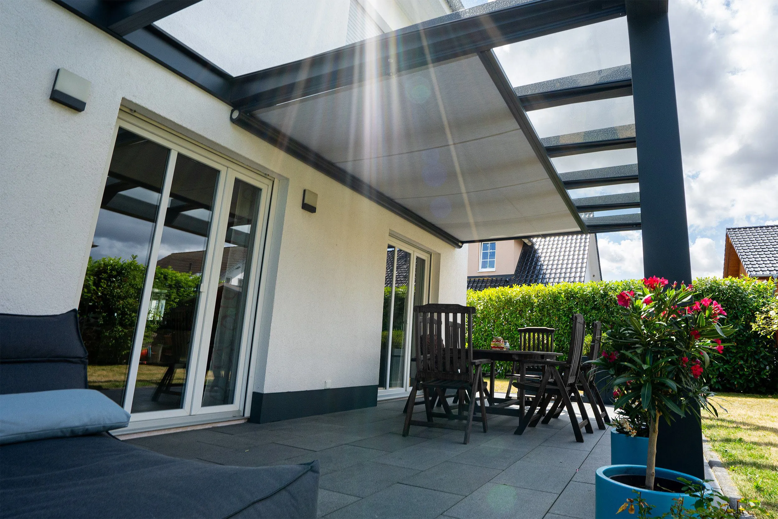 Under-awnings, by contrast, extend across the entire roof to provide uniform shading and are often motorised. They use higher-performance fabrics and are ideal for larger, south- or west-facing installations.